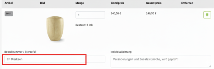 Im Warenkorb bei „Bestellnummer / Sterbefall“ das Kürzel und den Namen des Sterbefalls eintragen.