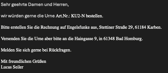 Wenn eine Urne bestellt werden muss, ist vorher intern nachzufragen, ob weitere Urnen benötigt werden, um Versandkosten zu sparen.